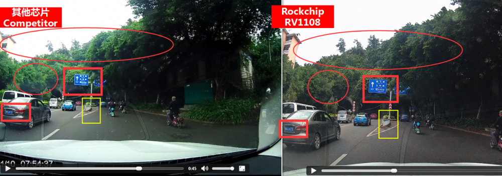 视频中红框指示处可以看出显著差别,在其他芯片拍摄画面中,由于光线太强反光明显,大楼消失在画面中,而RV1108很好的对图像曝光进行了处理,大楼清晰可见,凸显在WDR“宽动态”方面的优秀表现。