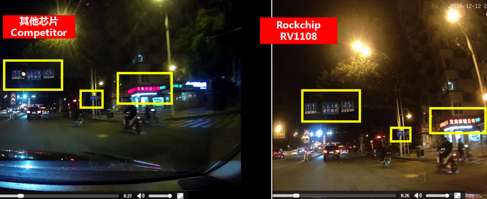 WDR宽动态技术作为一种比较先进的图形图像处理技术,直接影响着不同环境下的视频拍摄效果。Rockchip RV1108视觉处理芯片经过路测对比,印证了其超强的图像处理能力!搭载RV1108的行车记录仪无论在日拍、夜间或逆光的情境下都有优秀的画质表现,清晰度佳,凸显了RV1108图像处理在“宽动态”的明显优势。