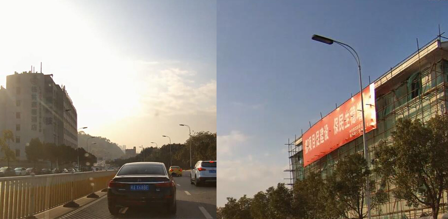 RV1108在逆光场景表现稳定,强光下,交通标识牌,建筑群、周边街景等依然清晰。体现了RV1108图像处理在“宽动态”方面的优势。