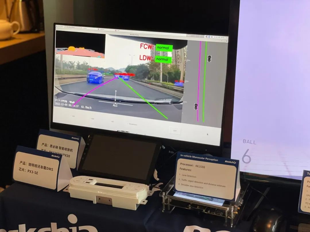 汽车电子展区,展出各类搭载瑞芯微方案的车载产品,涵盖乘用车方案、商用车方案及智能座舱方案,现场演示了搭载RK3588芯ADAS汽车视觉算法,可识别汽车在驻车行进中的车距路距及物体识别,以实现避障及360度环视功能,还展示了搭载RK3358M的中控屏等应用。