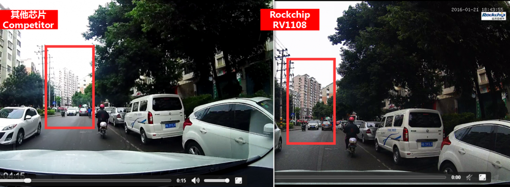 The images in red frame show the significantly difference in the video. Under the strong daylight, the image of competitor on the left obviously reflects the light and disappears the building, while RV1108 well-disposes the image exposure and clearly shows the building, hence highlighting the excellent WDR performance.